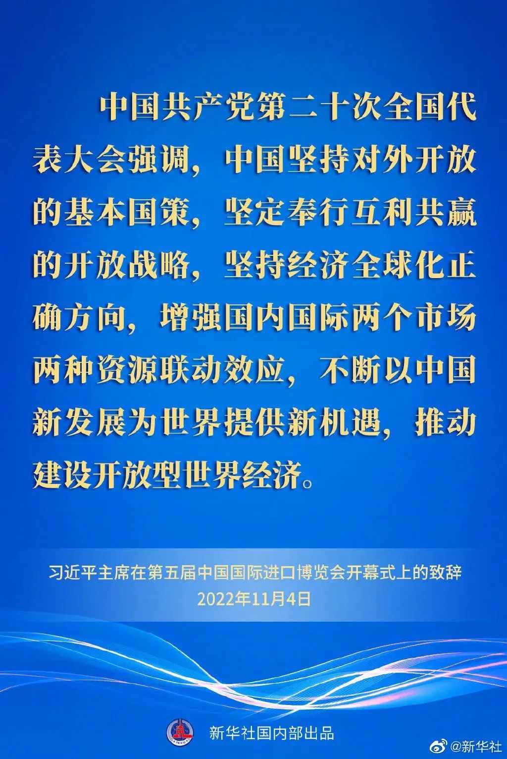 習(xí)近平指出,中國共產(chǎn)黨第二十次全國代表大會強(qiáng)調(diào),中國堅(jiān)持對外開放的基本國策,堅(jiān)定奉行互利共贏的開放戰(zhàn)略,堅(jiān)持經(jīng)濟(jì)全球化正確方向,增強(qiáng)國內(nèi)國際兩個(gè)市場兩種資源聯(lián)動效應(yīng),不斷以中國新發(fā)展為世界提供新機(jī)遇,推動建設(shè)開放型世界經(jīng)濟(jì)。