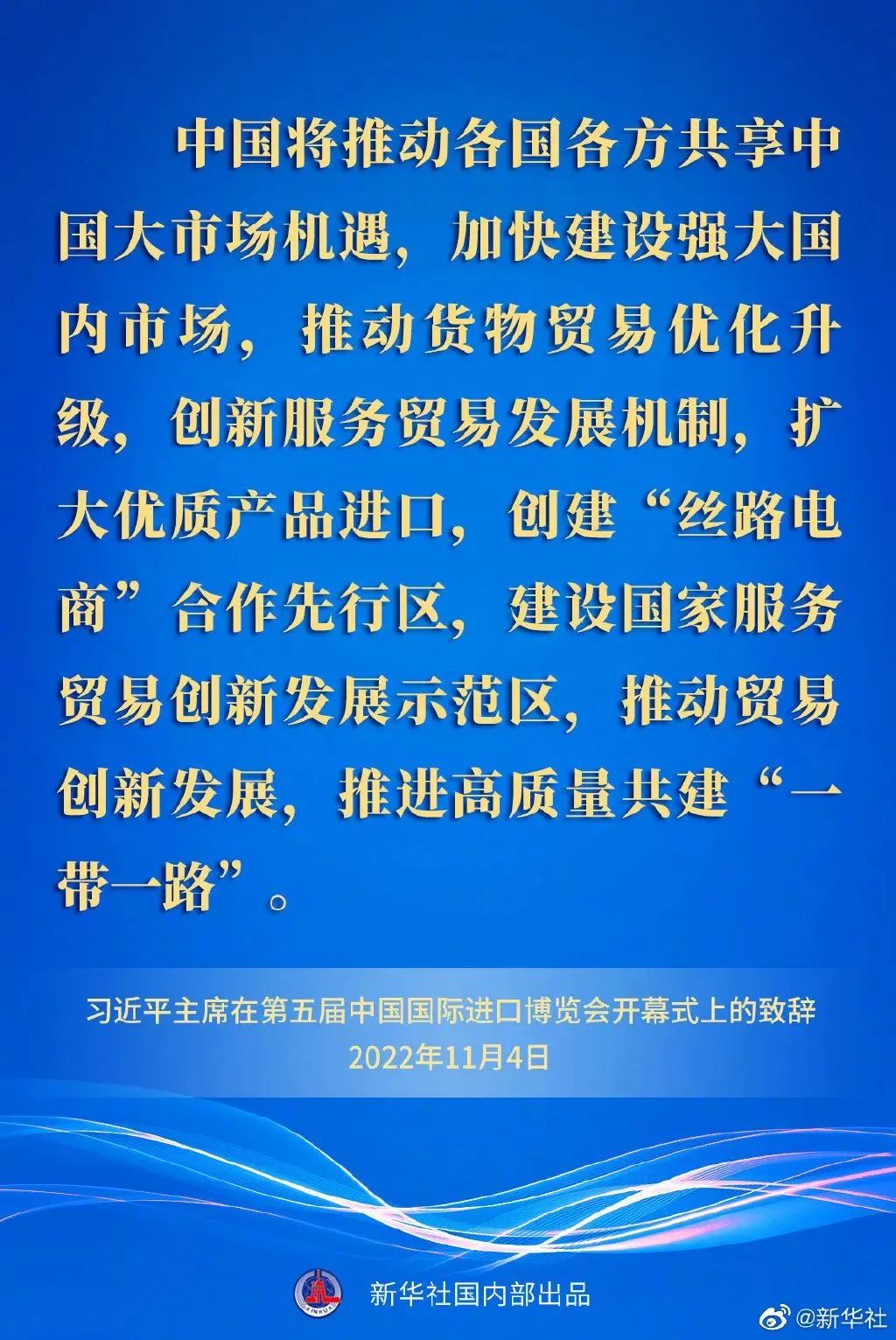 ——中國將推動各國各方共享中國大市場機(jī)遇,加快建設(shè)強(qiáng)大國內(nèi)市場,推動貨物貿(mào)易優(yōu)化升級,創(chuàng)新服務(wù)貿(mào)易發(fā)展機(jī)制,擴(kuò)大優(yōu)質(zhì)產(chǎn)品進(jìn)口,創(chuàng)建“絲路電商”合作先行區(qū),建設(shè)國家服務(wù)貿(mào)易創(chuàng)新發(fā)展示范區(qū),推動貿(mào)易創(chuàng)新發(fā)展,推進(jìn)高質(zhì)量共建“一帶一路”。