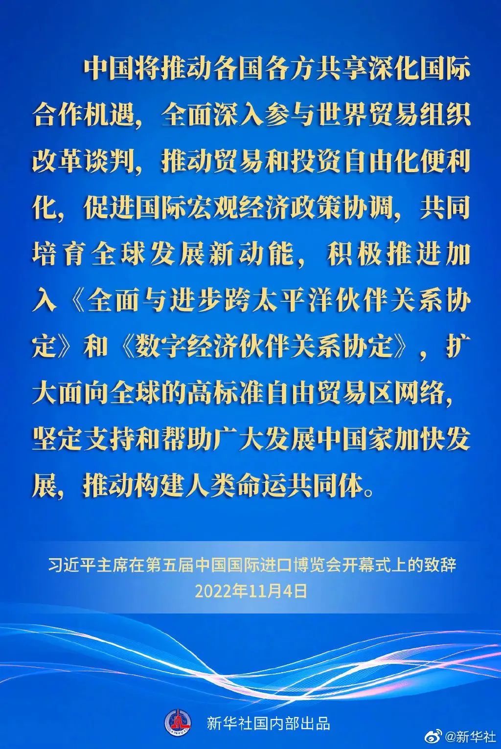 ——中國將推動各國各方共享深化國際合作機(jī)遇,全面深入?yún)⑴c世界貿(mào)易組織改革談判,推動貿(mào)易和投資自由化便利化,促進(jìn)國際宏觀經(jīng)濟(jì)政策協(xié)調(diào),共同培育全球發(fā)展新動能,積極推進(jìn)加入《全面與進(jìn)步跨太平洋伙伴關(guān)系協(xié)定》和《數(shù)字經(jīng)濟(jì)伙伴關(guān)系協(xié)定》,擴(kuò)大面向全球的高標(biāo)準(zhǔn)自由貿(mào)易區(qū)網(wǎng)絡(luò),堅(jiān)定支持和幫助廣大發(fā)展中國家加快發(fā)展,推動構(gòu)建人類命運(yùn)共同體。