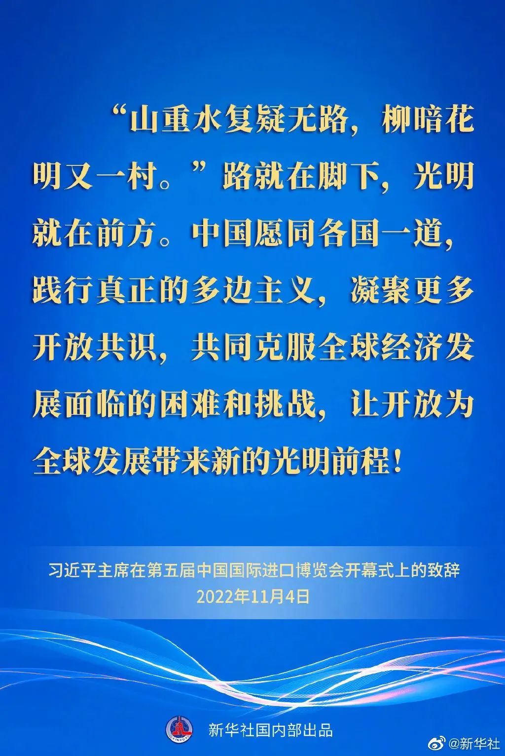 習(xí)近平最后強(qiáng)調(diào),路就在腳下,光明就在前方。中國愿同各國一道,踐行真正的多邊主義,凝聚更多開放共識,共同克服全球經(jīng)濟(jì)發(fā)展面臨的困難和挑戰(zhàn),讓開放為全球發(fā)展帶來新的光明前程!