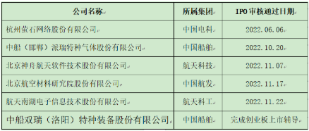 2022年的資本市場,行情不熱行業(yè)熱。從已經(jīng)公開披露的信息看,2022年中央企業(yè)專精特新小巨人在科創(chuàng)板和創(chuàng)業(yè)板持續(xù)發(fā)力,目前已有中無人機(jī)(航空工業(yè))、國博電子(中國電科)、振華風(fēng)光(中國電子)、昆船智能等7家企業(yè)IPO上市。此外,截至2022年11月30日,已有多家央企專精特新企業(yè)IPO申請通過了科創(chuàng)板上市委審核和創(chuàng)業(yè)板上市輔導(dǎo),其中有兩家中國船舶集團(tuán)旗下企業(yè)(見下表)。這些企業(yè)將在2023年IPO上市,主要來自船舶、航空、航天和軍工電子行業(yè)。