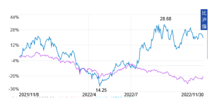 很顯然,中船系憑其創(chuàng)新和產(chǎn)業(yè)鏈優(yōu)勢已成為中國資本市場一股新生力量。中國船舶集團(tuán)龍頭股中國船舶(600150)2022年11月30日收盤價(jià)比去年同期上漲約20%,跑贏大市。下圖為2022年11月30日中國船舶與滬深300指數(shù)漲跌對(duì)比圖,上部曲線為中國船舶,下部曲線為滬深300。