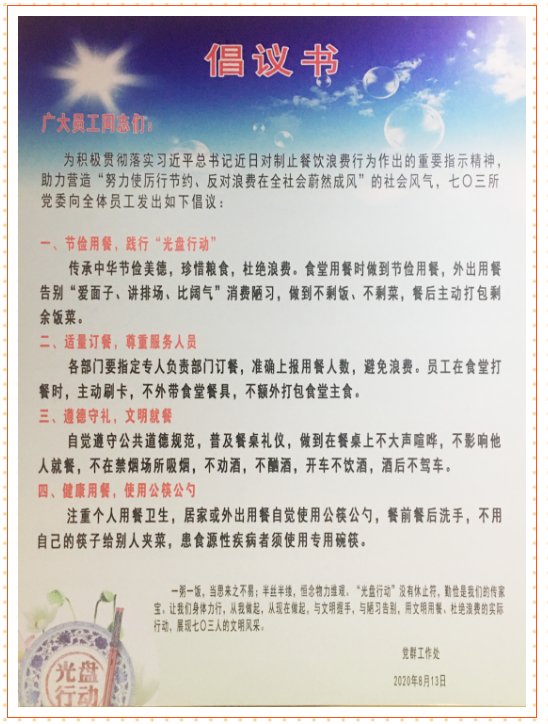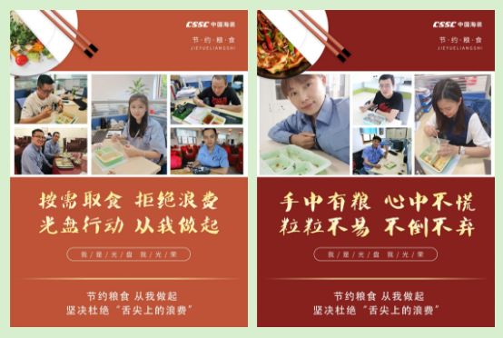 連日來,中國船舶集團(tuán)多家成員單位積極踐行習(xí)近平總書記對制止餐飲浪費(fèi)行為的重要指示精神,進(jìn)一步加強(qiáng)宣傳教育,培養(yǎng)節(jié)約習(xí)慣。首先刊載有特色的宣傳海報(bào)、條幅,