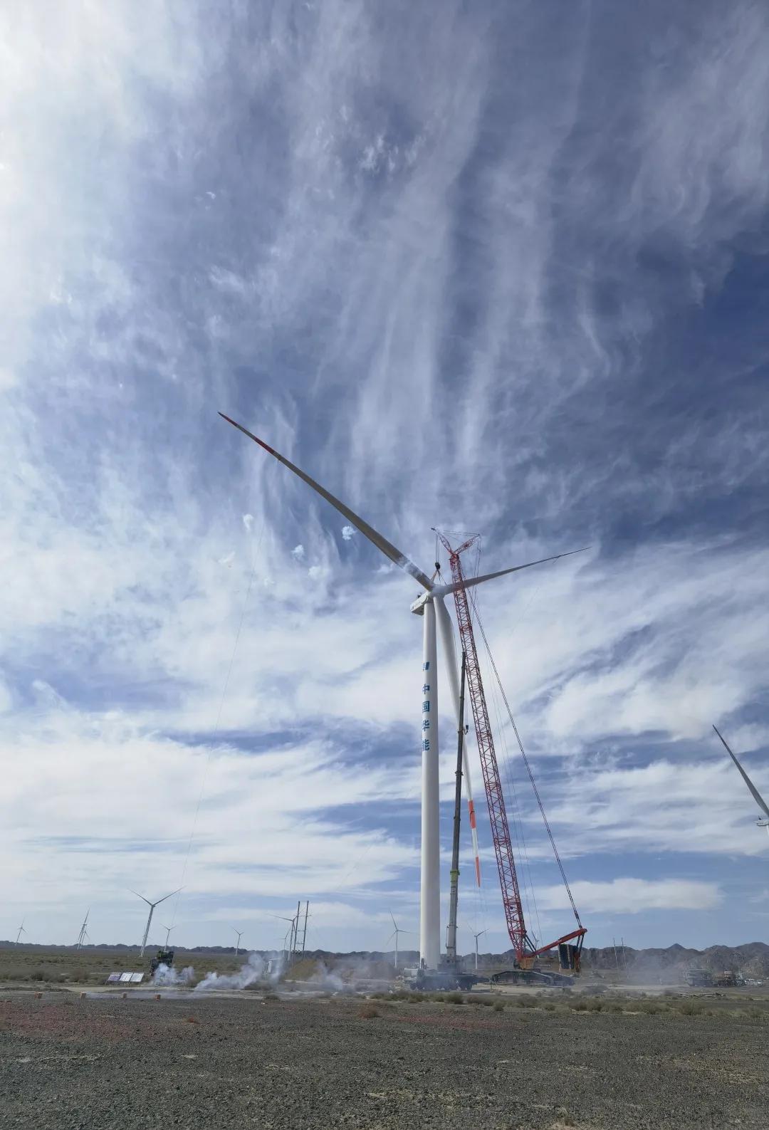 該項目于4月12日啟動首臺機組吊裝,中國海裝項目人員提前制訂吊裝調試方案及安全預案,采取“邊吊裝邊調試”的方式加快整體工程進度,克服戈壁灘高溫天氣和疫情反復等困難,于7月10日實現首批100MW實現全容量并網,8月20日實現59臺機組全部吊裝。