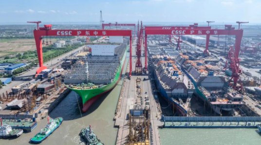 近日,24000TEU系列集裝箱船(H1873A)在中國船舶集團旗下滬東中華長興島西部廠區1號船塢提前11天出塢。在建造團隊努力下,該船出塢完整性達到系列船最佳,為縮短碼頭建造周期創造有利條件。