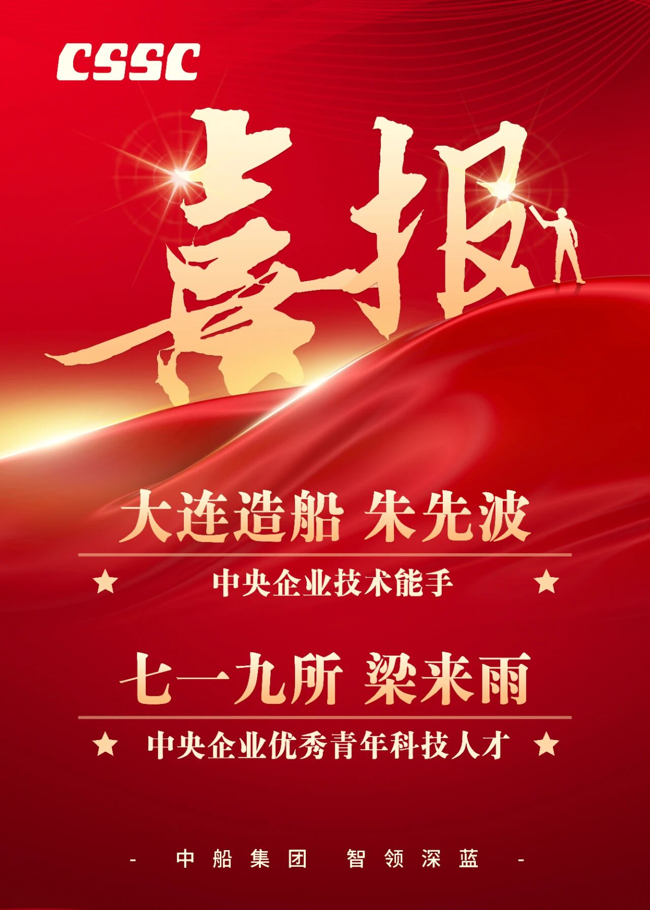中國船舶集團有限公司旗下大連船舶重工集團有限公司朱先波,獲評第二屆中央企業技術能手;中船集團旗下第七一九研究所梁來雨,獲評第二屆中央企業優秀青年科技人才。