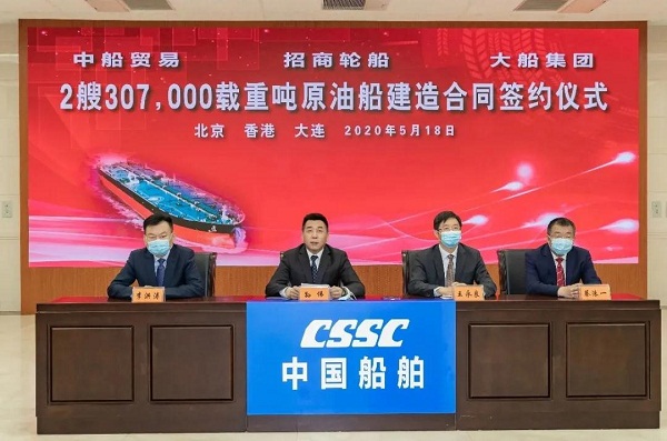 ????5月18日,中國(guó)船舶集團(tuán)旗下大船集團(tuán)、中船貿(mào)易與招商局集團(tuán)旗下招商輪船在北京、大連、香港三地以“云簽約”方式簽署2艘30.7萬(wàn)載重噸原油船建造合同。中國(guó)船舶集團(tuán)副總經(jīng)理孫偉、招商局集團(tuán)副總經(jīng)理王宏、招商輪船董事長(zhǎng)謝春林出席簽約儀式,中船貿(mào)易董事長(zhǎng)李洪濤、大船集團(tuán)總經(jīng)理?xiàng)钪局摇⒄猩梯喆偨?jīng)理王永新代表各方在建造合同上簽字。