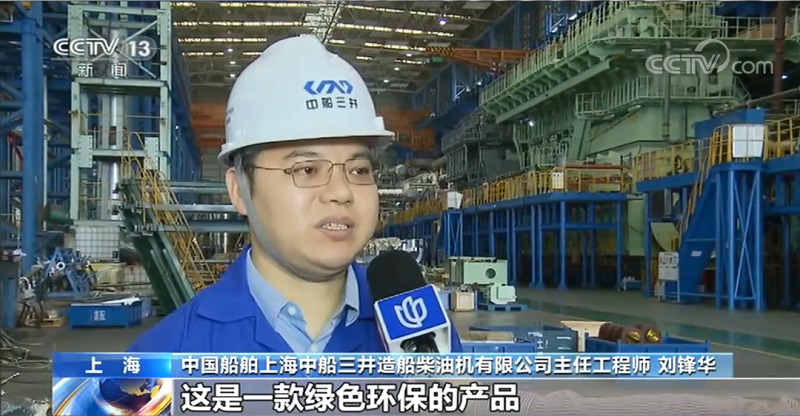 ????中國船舶上海中船三井造船柴油機有限公司主任工程師 劉鋒華:尺寸最大,達(dá)到了5層樓那么高,功率達(dá)到了63800多千瓦,功率也是最大的。這是一款綠色環(huán)保的產(chǎn)品,使用燃?xì)膺\行時氮氧化物的排放不到常規(guī)發(fā)動機的十分之一,硫氧化物和顆粒物的排放也是非常好的,不用裝任何后處理設(shè)備,都可以滿足IMO(國際海事組織)最新的排放法規(guī)要求。