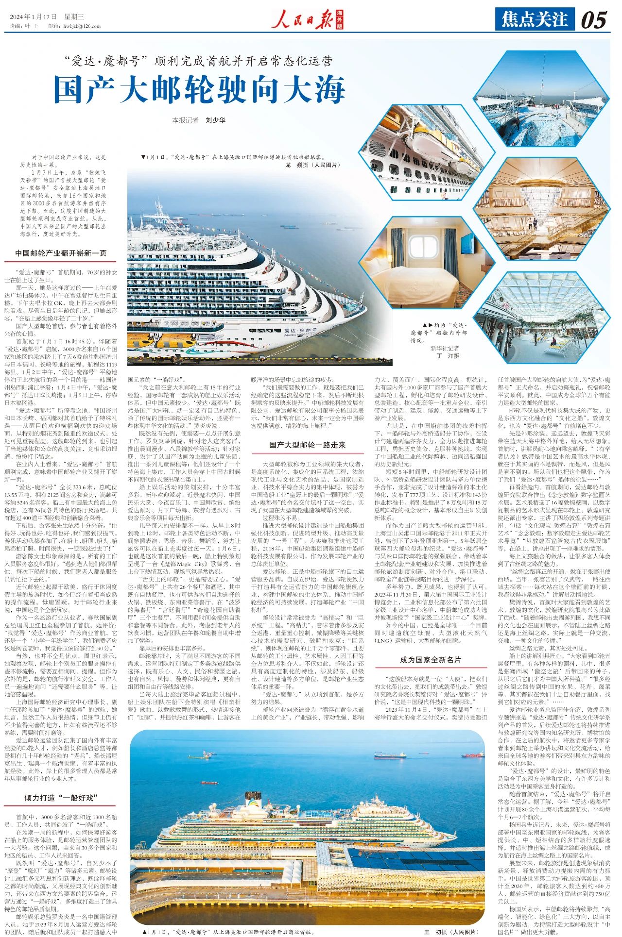 1月17日,人民日報(bào)海外版第五版焦點(diǎn)關(guān)注刊發(fā)整版文章,聚焦“愛達(dá)·魔都號(hào)”。
